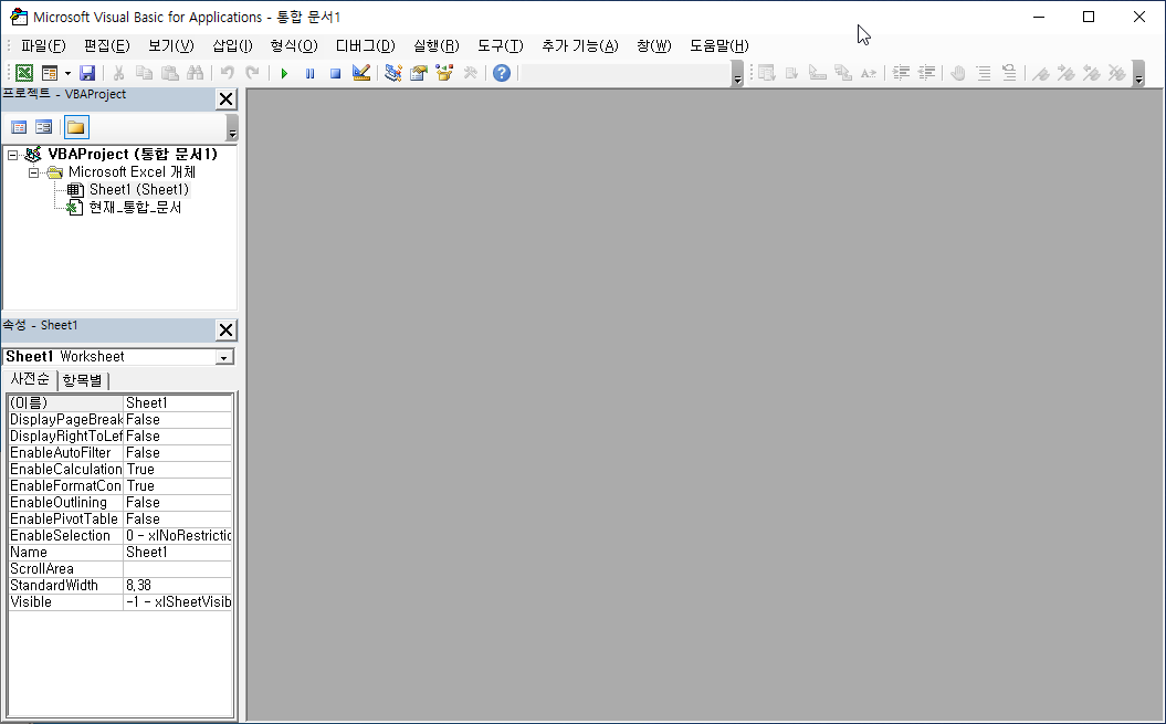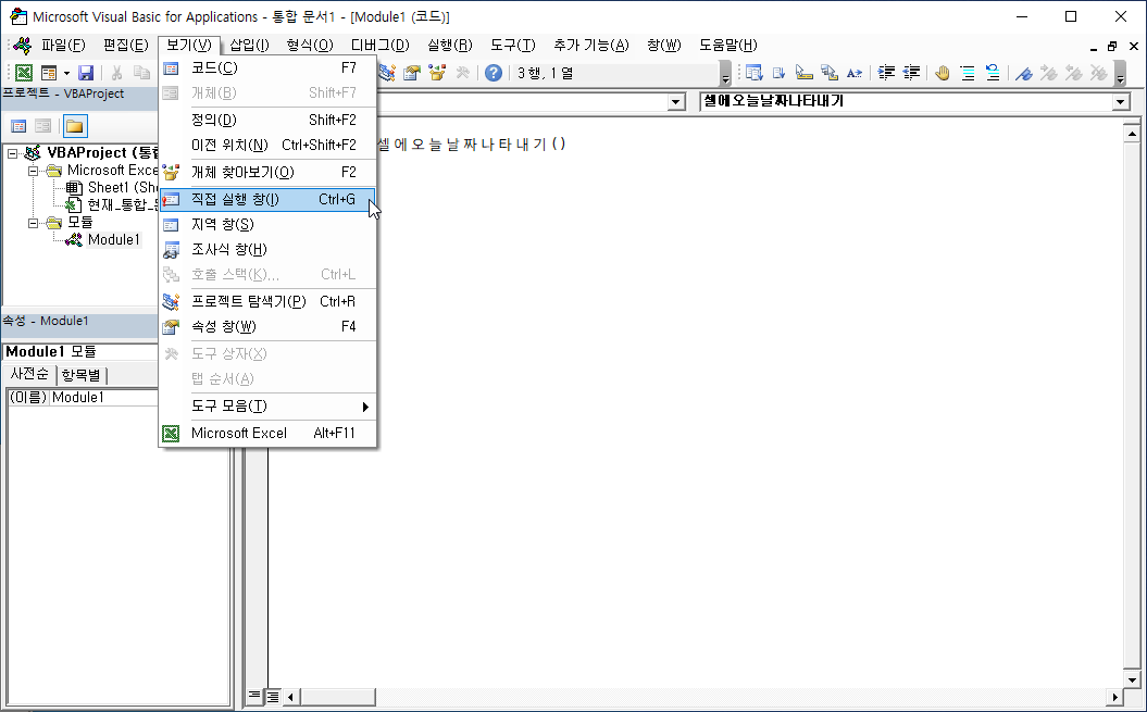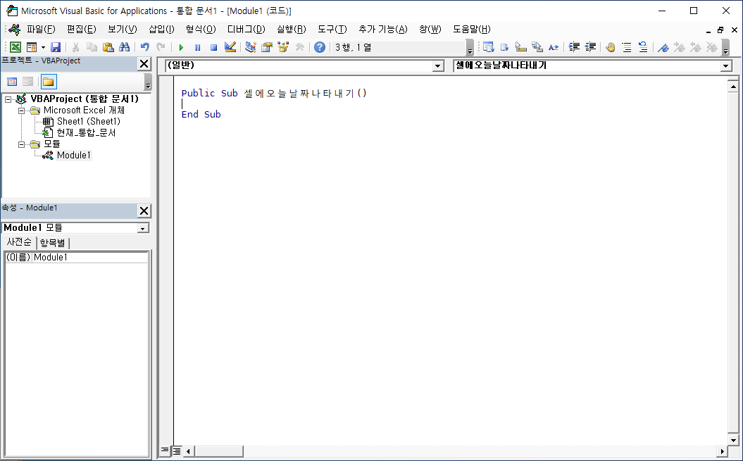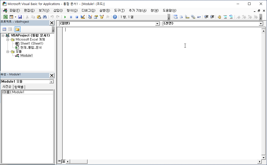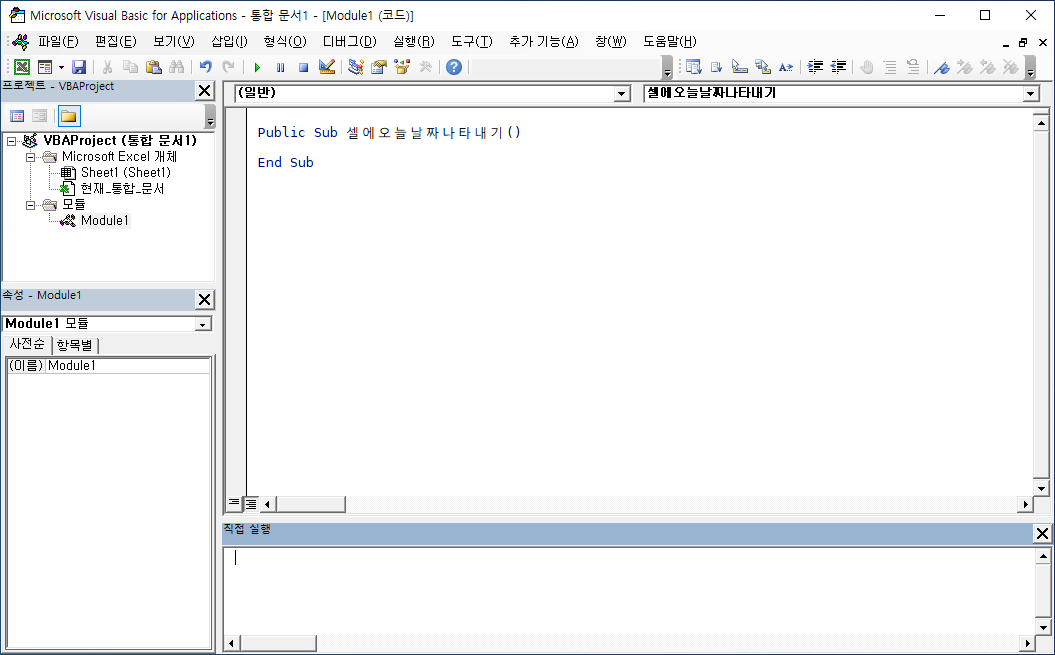 프로젝트 탐색기에 [모듈] 폴더가 표시되고, [Module1] 파일이 새로 생겼습니다.
