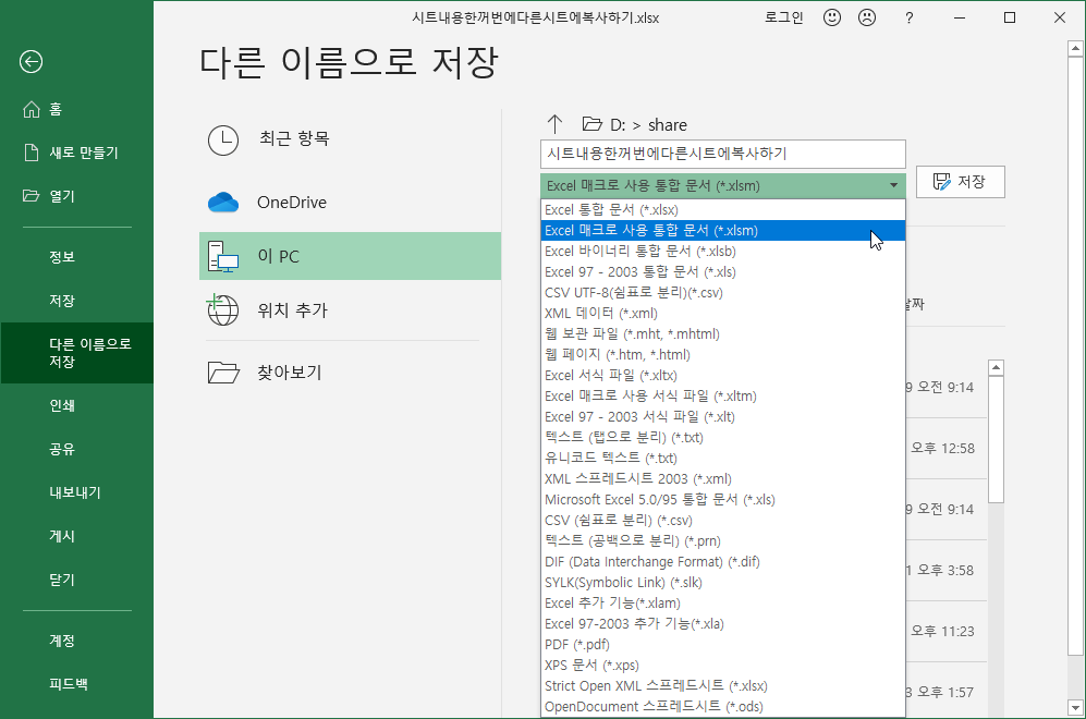 [파일 형식]을 [Excel 매크로 사용 통합 문서(*.xlsm)]으로 바꾸고 [저장]을 누릅니다.