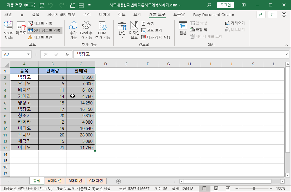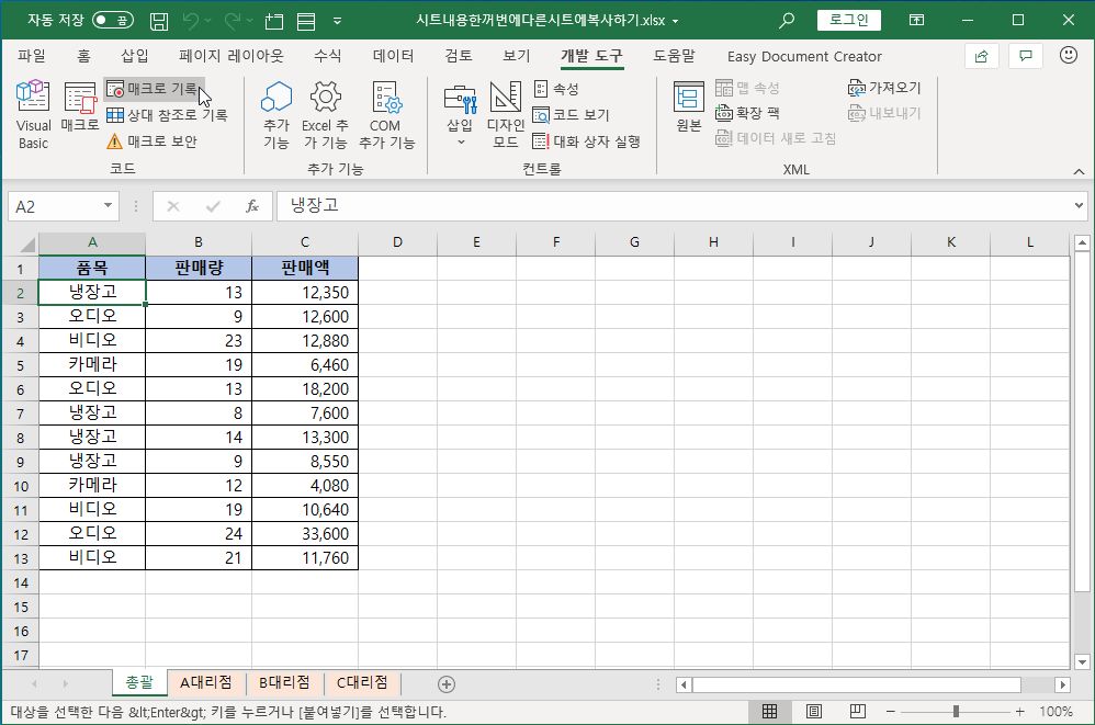 B대리점 시트와 C대리점 시트에서도 매크로를 실행해 잘 동작하는지 확인해 봐도 됩니다.