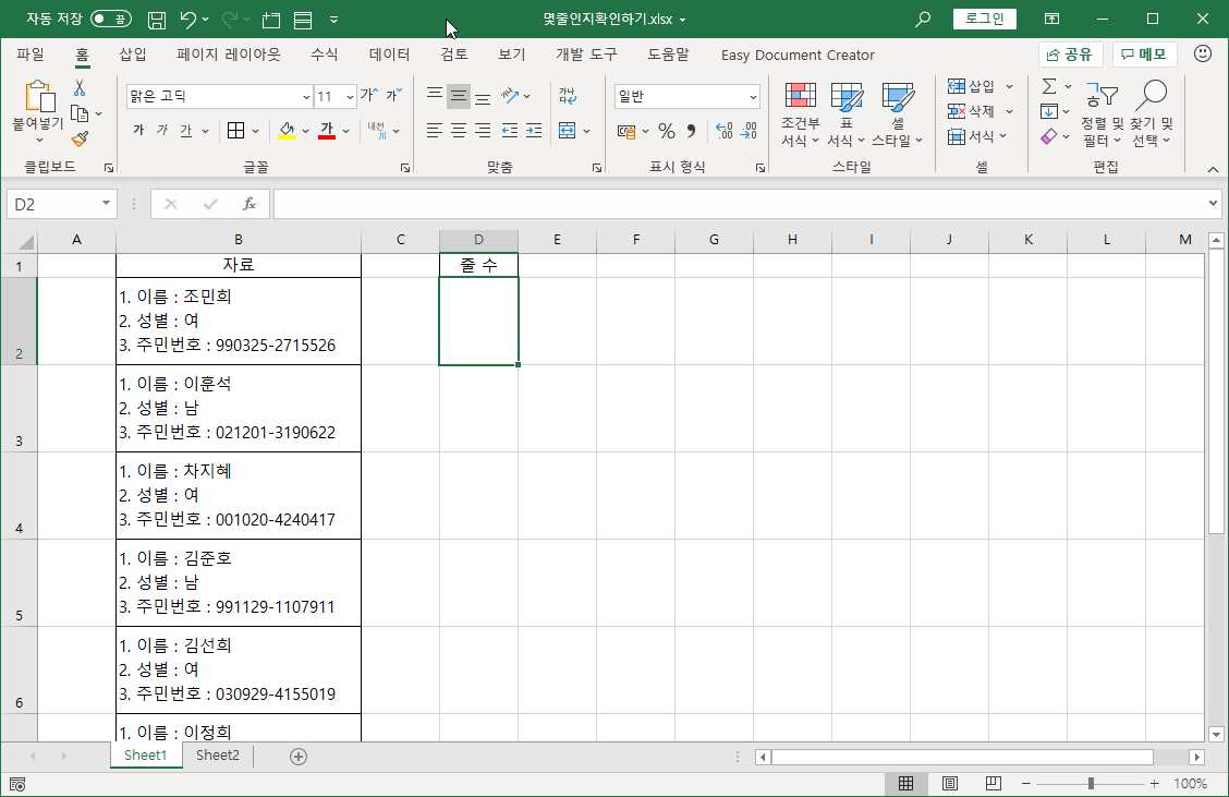 한 셀에 여러 줄로 데이터를 입력한 것은 엑셀의 데이터 관리 기능에 비추어 보면 올바른 방법이 아닙니다.