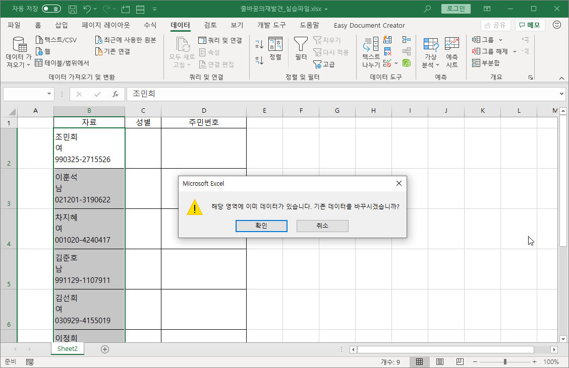 미리 나누어진 데이터가 표시될 셀을 준비해 뒀으므로 [확인] 단추만 누르면 작업이 마무리 됩니다.