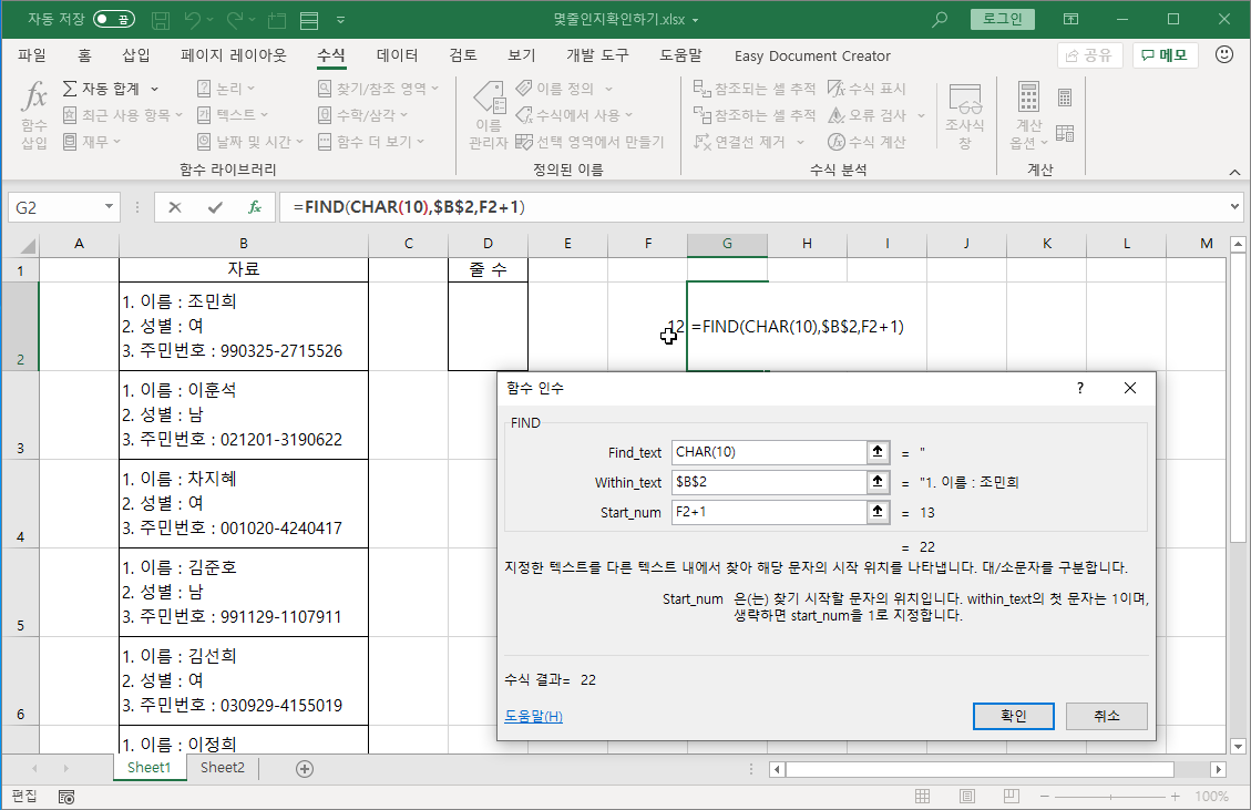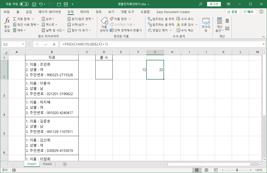 그냥 한 셀에 연속해서 보이는게 아니라 여러 줄로 나타나게 만들어 보는 겁니다.