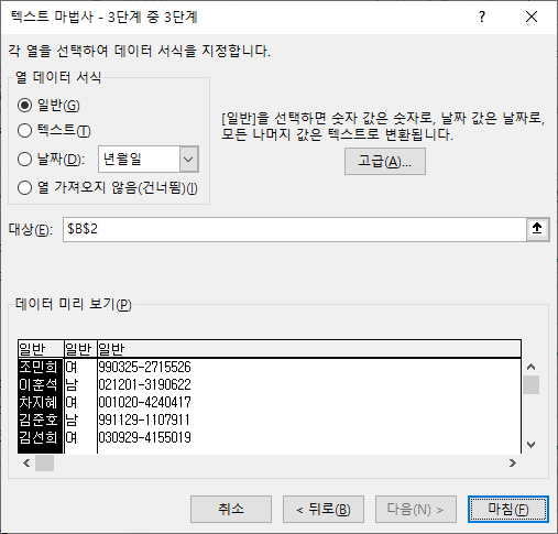 텍스트 마법사 3단계 중 1단계에선 [구분 기호로 분리됨]을 선택합니다.
