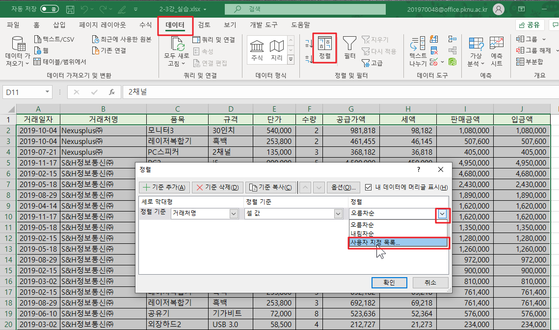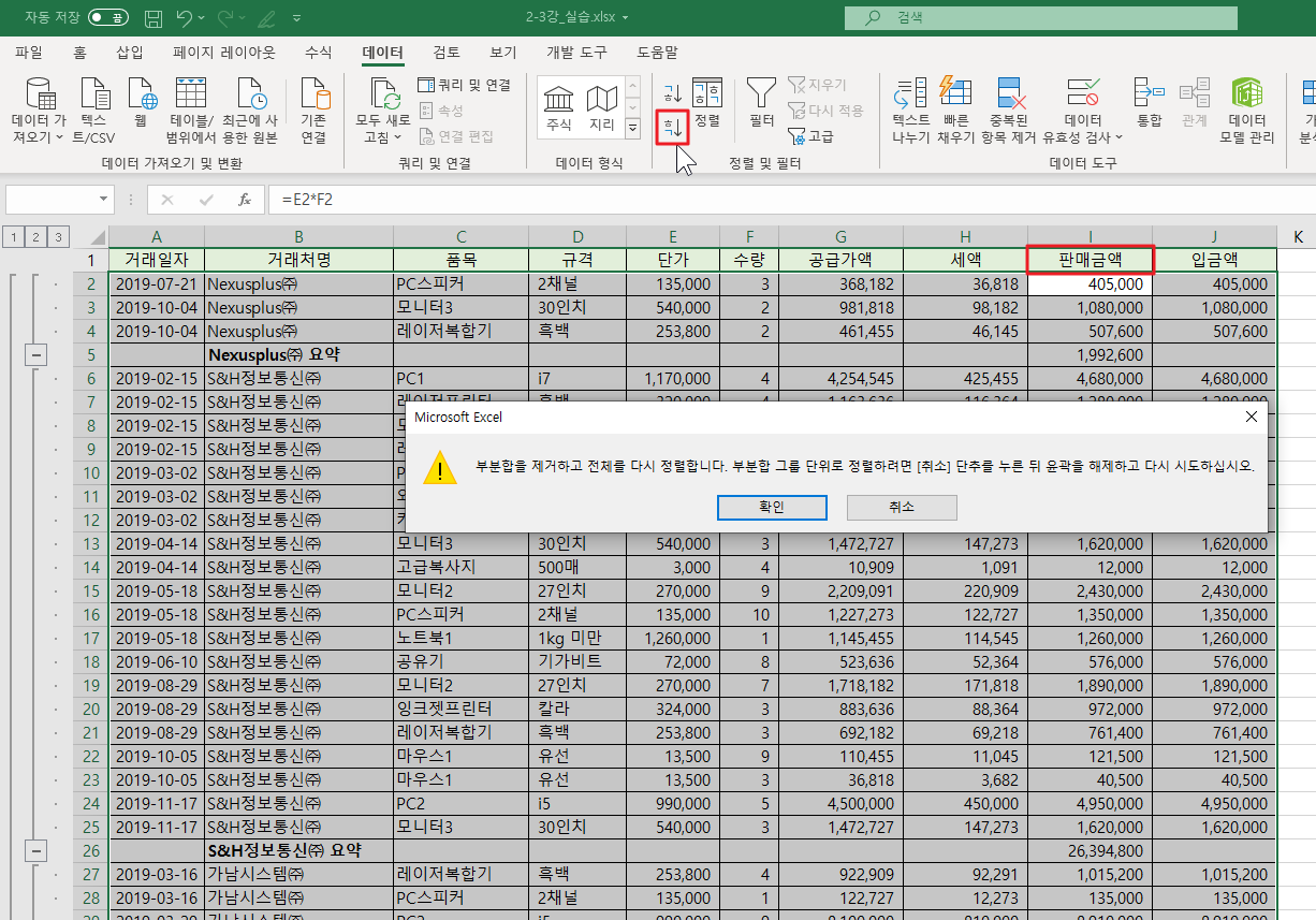 거래처명을 기준으로 판매금액의 합계를 구할 것이기 때문에 먼저 거래처 필드를 오름차순 정렬합니다.