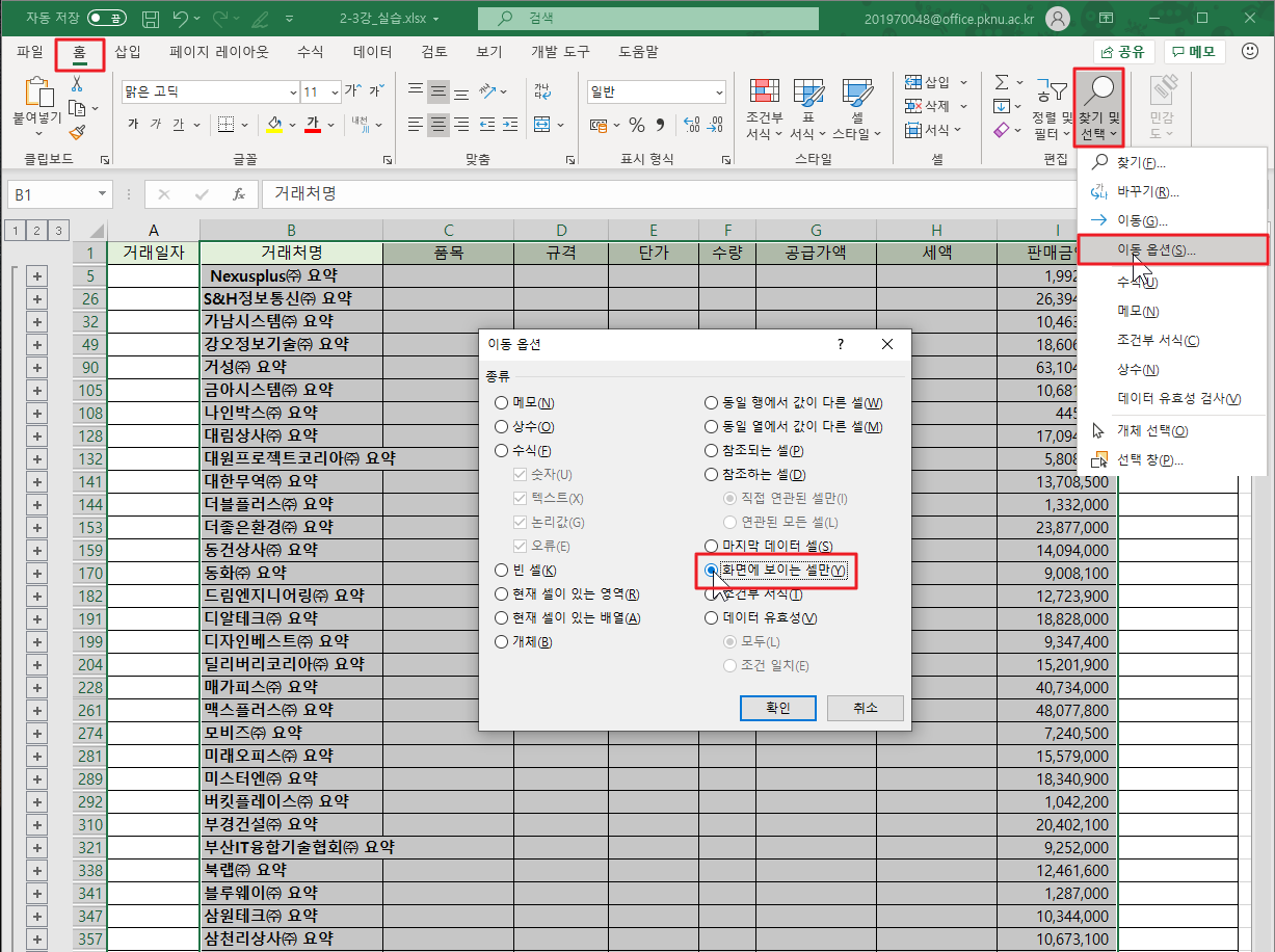 이동 옵션 대화상자가 실행되면 [화면에 보이는 셀만]을 선택하고 [확인]을 누릅니다.