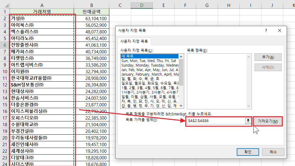 6. [목록 가져올 범위] 입력창에 커서를 두고 거래처명 범위 [A2:A86]를 지정하고 [가져오기] 버튼을 누릅니다.