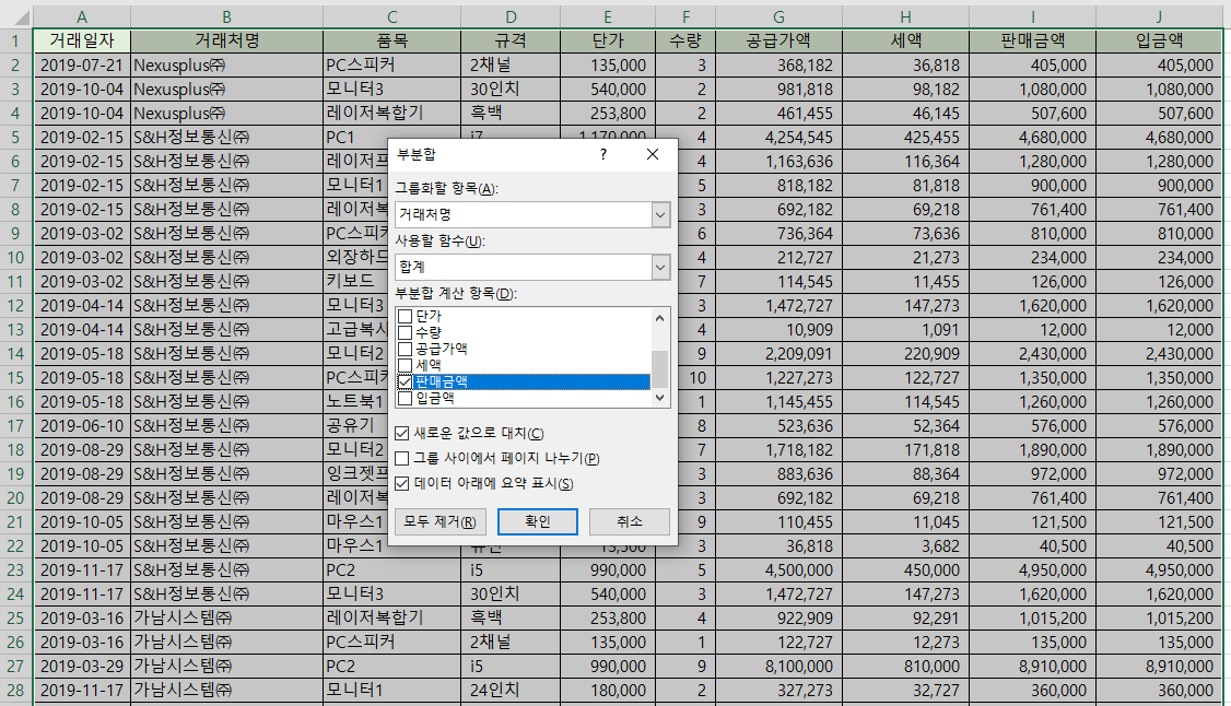 [그룹화할 항목]은 '거래처명', [사용할 함수]는 '합계', [부분합 계산 항목]은 '판매금액'을 선택하고 [확인]을 누릅니다.