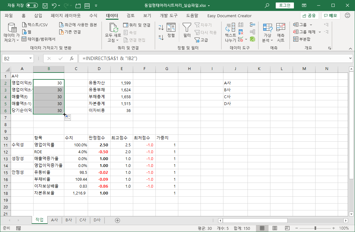2. 회사명을 선택하면 해당하는 회사 시트에서 영업 이익, 매출액, 유동자산, 유동부채 등의 데이터가 자동으로 조회되어 표시되도록 하려고 합니다.