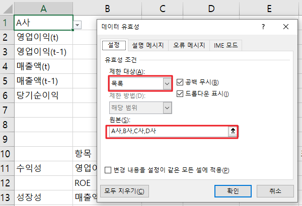 수식에서 A사 대신 A1 셀로 변경합니다.