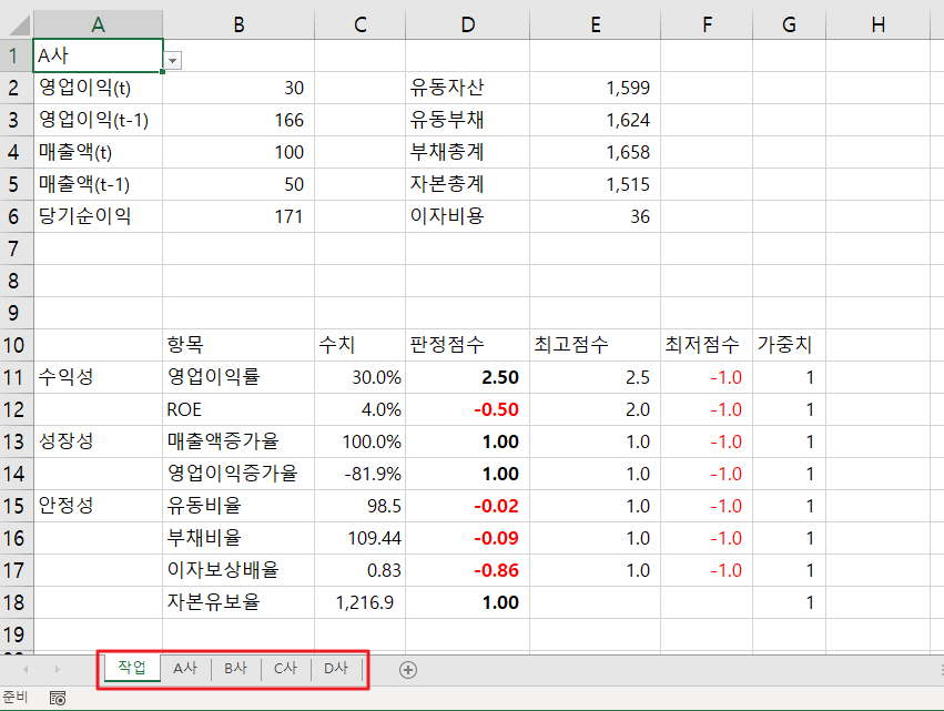 시트 형태는 모두 동일하고 회사별 데이터만 다르게 되어 있습니다.