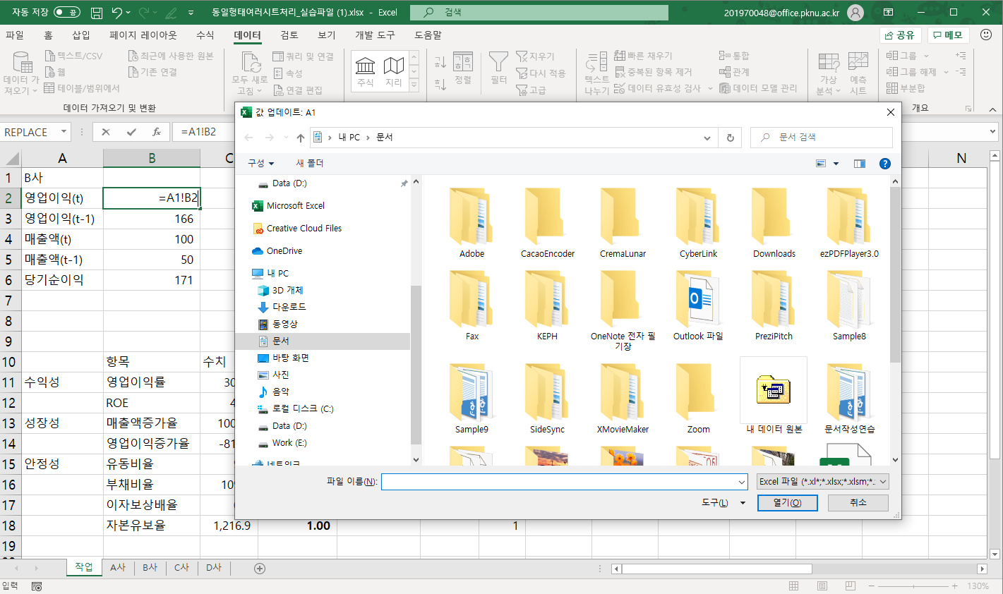 이렇게 되면 A1이라는 이름의 시트는 없기 때문에 '값 업데이트: A1' 대화 상자가 표시되고 파일을 선택하라고 합니다.