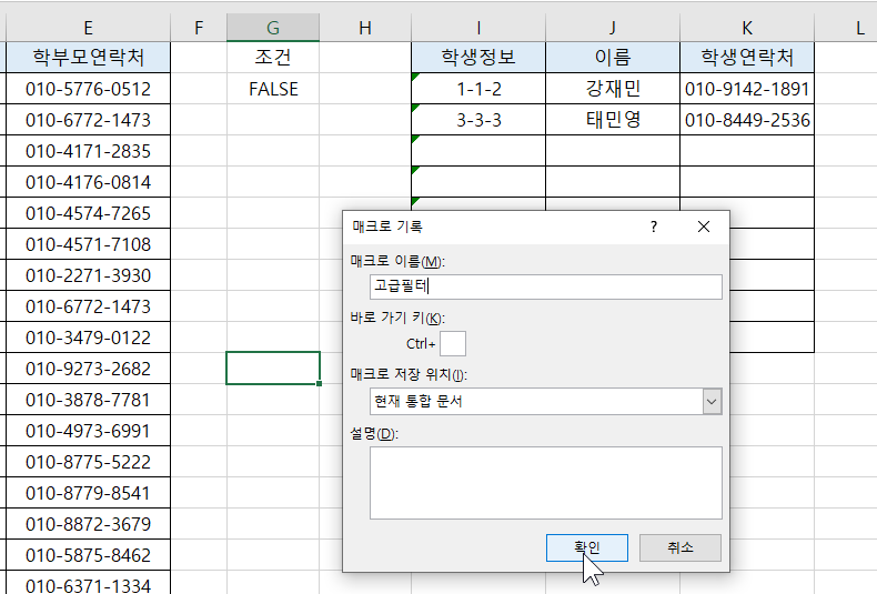 물론 학생정보를 기준으로 정렬해서 뽑아볼 수도 있지만 지금 소개하는 고급 필터 사용법을 알면 별도의 셀에 학생 정보를 추출할 수 있습니다.