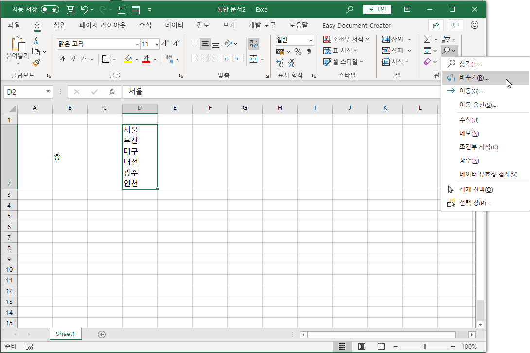 예를 들어 [D2] 셀에 서울부터 인천까지 여러 줄을 입력했습니다.