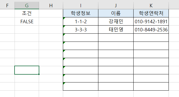 [I3:K3] 셀 범위에 '학생정보, 이름, 학생연락처'를 입력합니다. 열 너비를 조금 넓혀 둡니다.