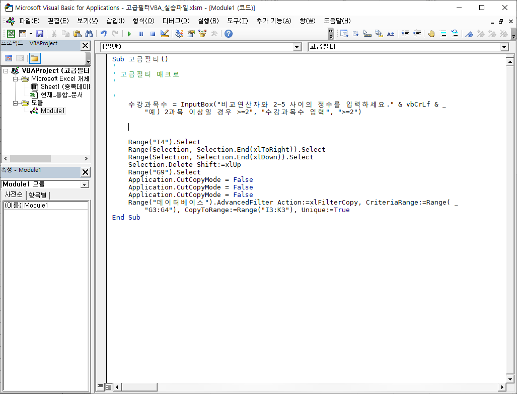 이번에는 고급 필터 조건식을 직접 수정하지 않고 InputBox에서 입력 받은 과목수에 맞게 내부적으로 수식이 수정되도록 해야 합니다.