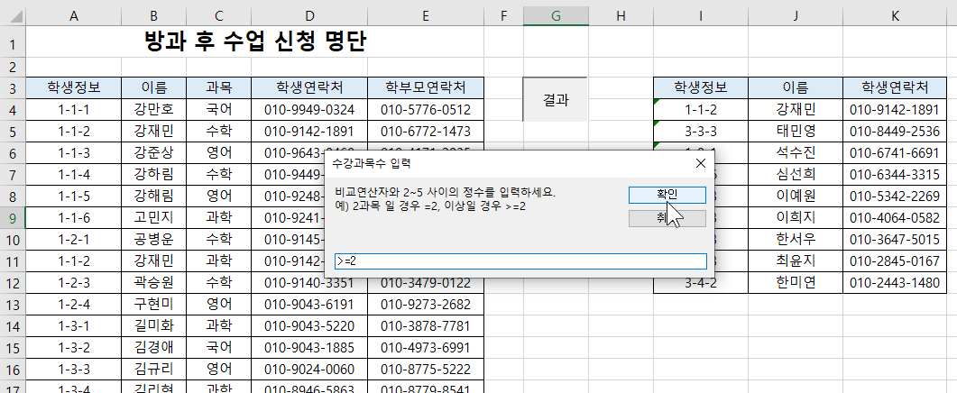수강과목수=inputbox("비교연산자와 2~5 사이의 정수를 입력하세요. 예) 2과목 이상일 경우 >=2","수강과목수 입력",">=2")