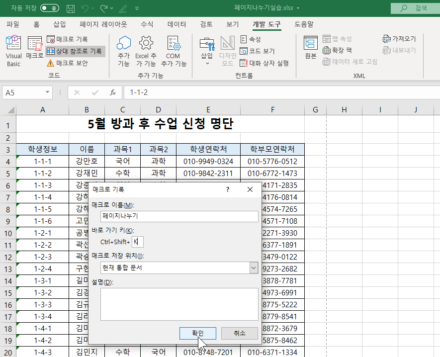 그럼 계속 1-1-1 강만호 학생 행까지 페이지 나누는 작업이 반복되겠죠?