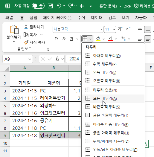 데이터를 입력하면 자동으로 테두리가 생기는 방법이 있습니다.
