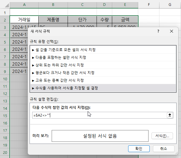 3. 수식 입력 창을 선택한 후 [A2] 셀을 선택하고 <F4> 키를 두 번 눌러 열 번호는 고정하고 행 번호는 상대 참조합니다. <>(같지 않다) 연산자를 입력하고 “”(공백)을 입력합니다. 그러면 'A2셀이 비어있지 않다면'이라는 수식으로, 즉 데이터를 입력하면 ~하라라는 수식이 되는겁니다.