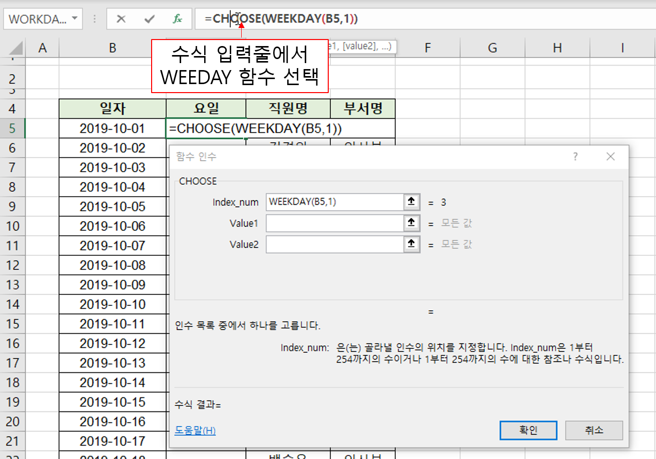 자~ 그럼 CHOOSE 함수와 WEEKDAY 함수를 중첩하여 요일을 구해봅시다.