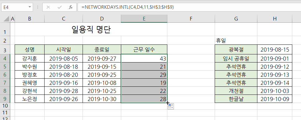수식을 복사하여 나머지 명단의 근무 일수가 구합니다.