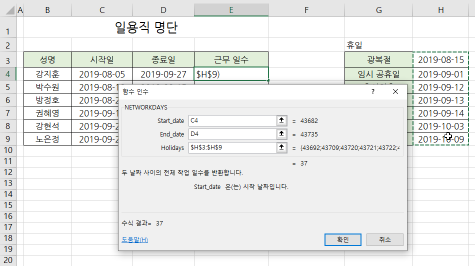 Holidays 인수 범위는 <F4>를 눌러 절대 참조합니다.