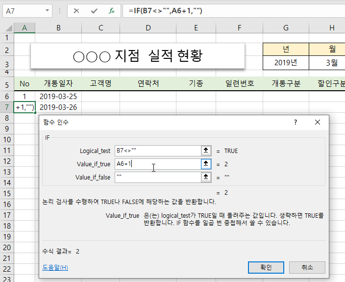 [A7] 셀에 작성한 수식은 개통일자를 입력하면 바로 위에 번호에 1을 더하는 수식입니다.