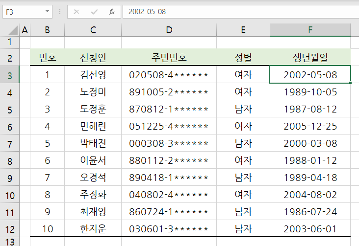 짜잔~ 생년월일이 날짜 형식으로 변환되었고 1900년 이후생과 2000년 이후 생을 구분해서 변환되었습니다.