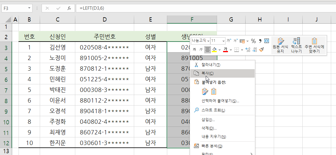 생년월일에 해당하는 주민번호 왼쪽 6자리 값을 추출하기 위해 LEFT 함수를 사용합니다.