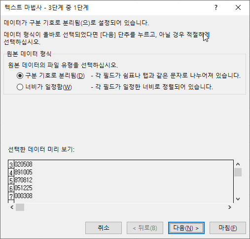 4. 텍스트 나누기는 마법사 3단계를 거치며 텍스트를 나누어 줍니다.