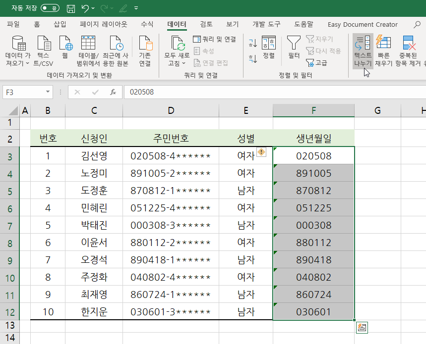3. 생년월일 범위를 그대로 선택한 상태에서 [데이터] 탭 → [데이터 도구] → [텍스트 나누기]를 선택합니다.