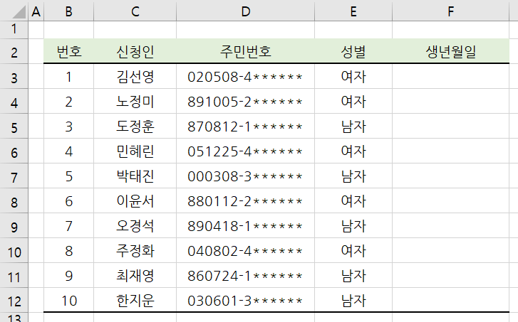 아래 예제에서 주민번호로 신청인의 생년월일을 구해봅시다.