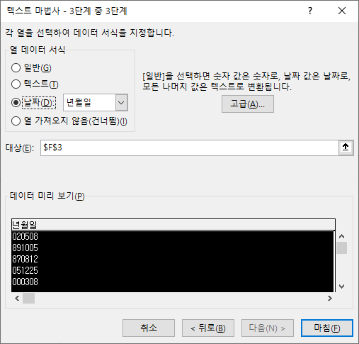 5. 데이터 서식을 [날짜]로 선택하고 [마침] 버튼을 클릭합니다.