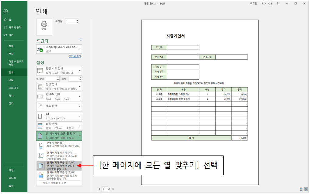 3. [한 페이지에 모든 열 맞추기]를 선택하여 배율 축소를 하면 용지 한 폭에 인쇄가 됩니다.