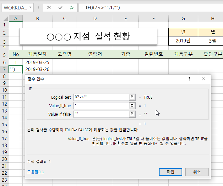 조건이 참이면 Value_if_true 인수는 1이 되고 거짓이면 Value_if_false 인수는 “”을 입력하고 [확인] 버튼을 클릭합니다.