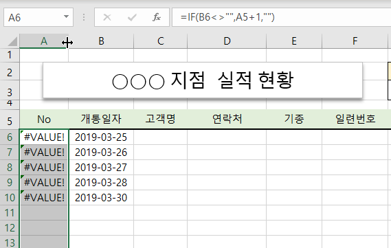개통일자가 입력되면 [A5] 셀에 더하기 1을 해서 일련번호를 매기는데 [A5] 셀은 숫자가 아니죠?