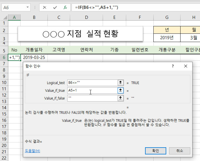 Value_if_true 인수를 1이 아닌 A6+1 로 수정하고 [확인] 버튼을 클릭합니다.
