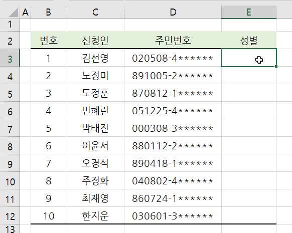 여기서 주민번호 정보만으로 성별을 구해보겠습니다.