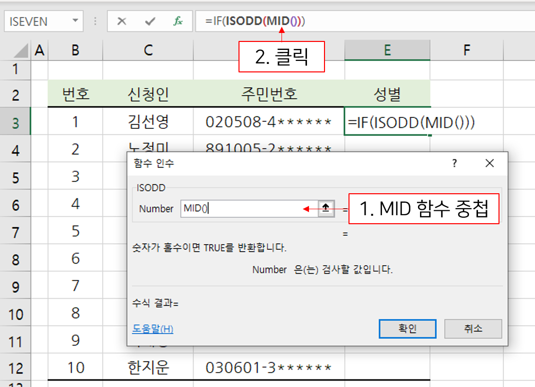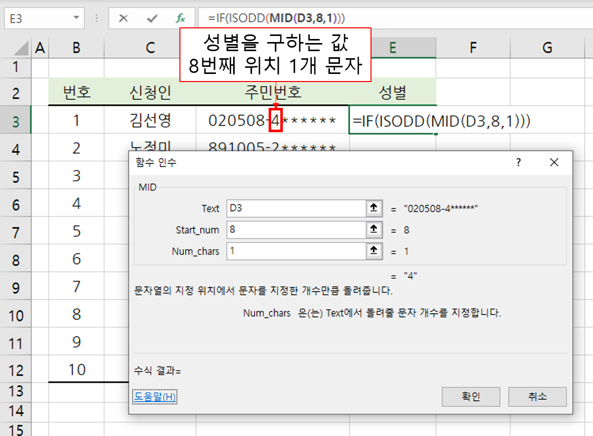 3. 주민번호에서 성별을 구분하는 값을 추출하는 MID 함수를 사용.