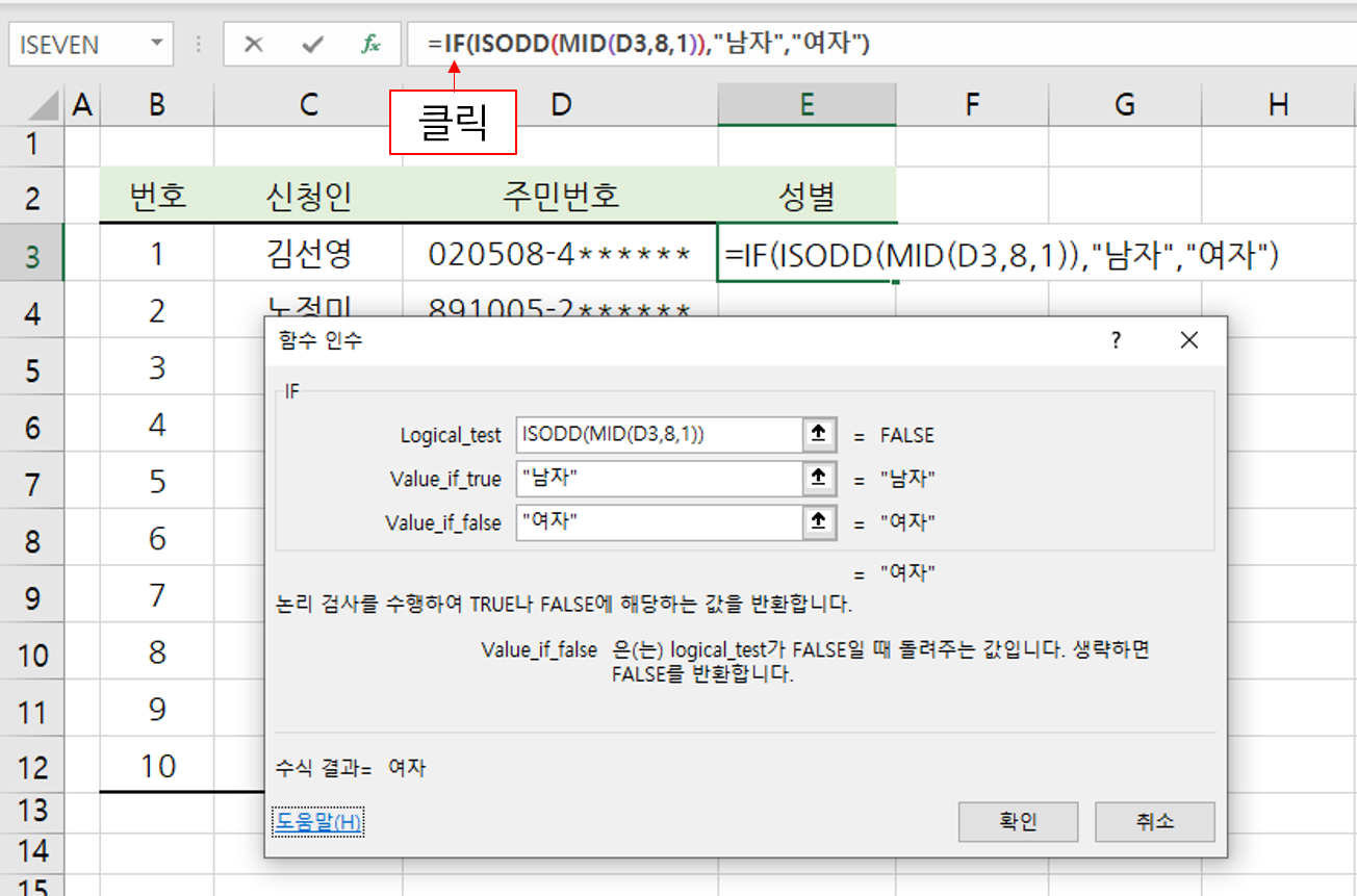 이렇게 3개 함수를 중첩하여 성별을 구할 수 있습니다.