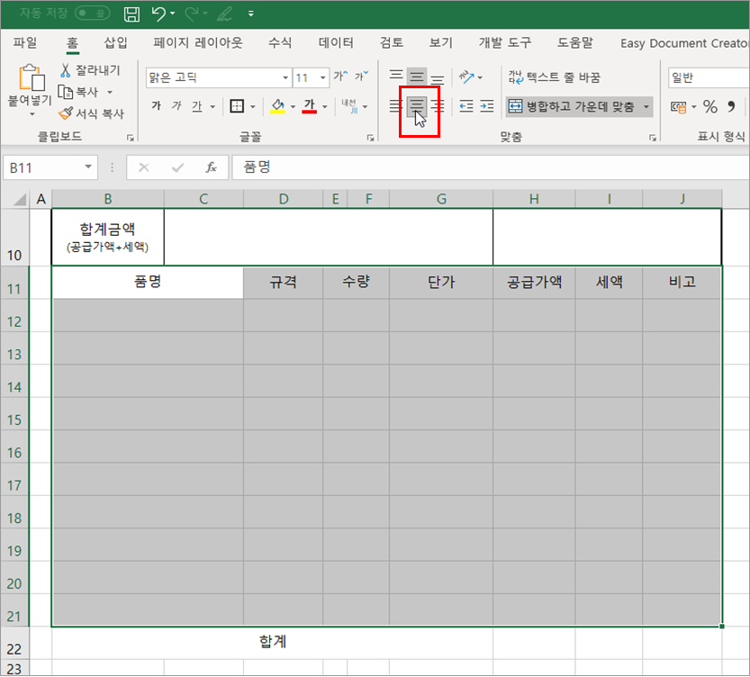 9. [B11:J21] 셀 범위를 선택하고 [가운데 맞춤]을 선택합니다.