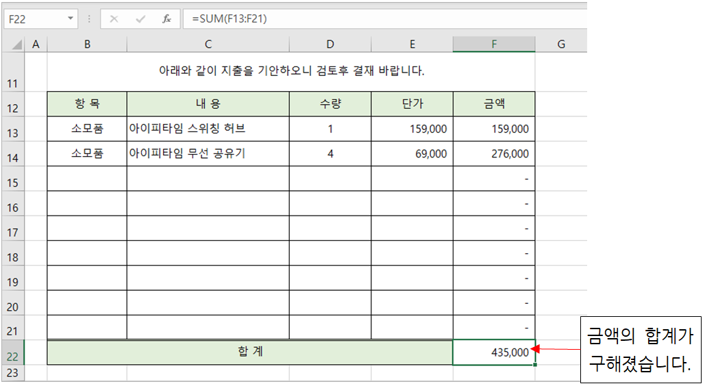 선택한 마지막 셀 [F22]에 합계가 계산됩니다.