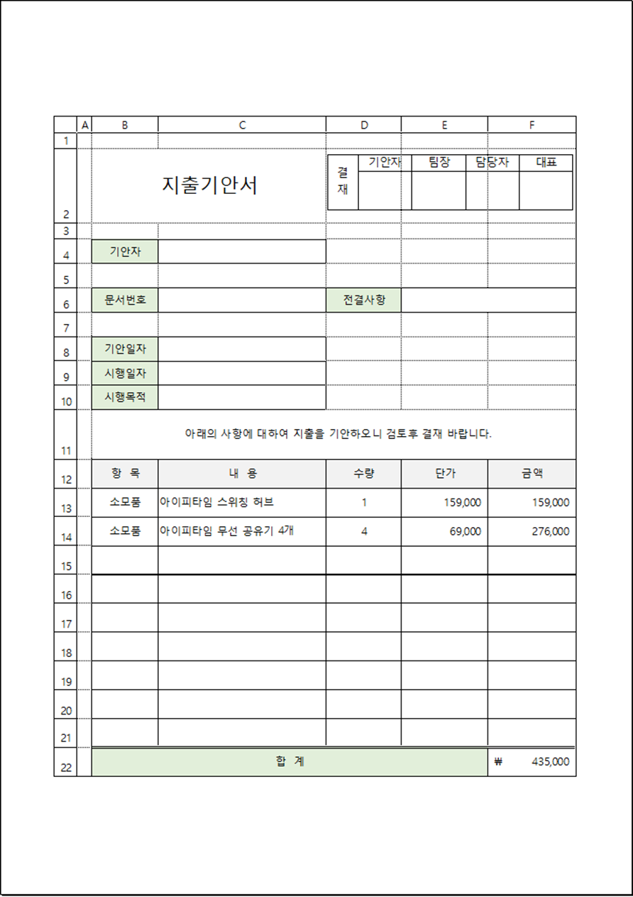 그리고 열 너비도 지출기안서와 달라 ‘결재란’ 모양에 맞지 않습니다.