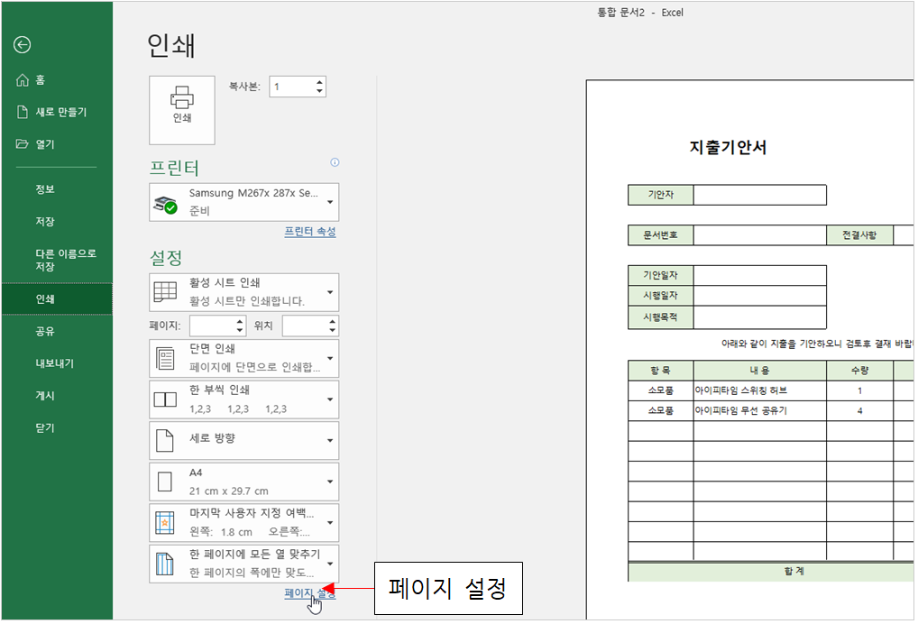 지출기안서 양식만 용지에 인쇄되도록 먼저 인쇄 영역을 설정하겠습니다.