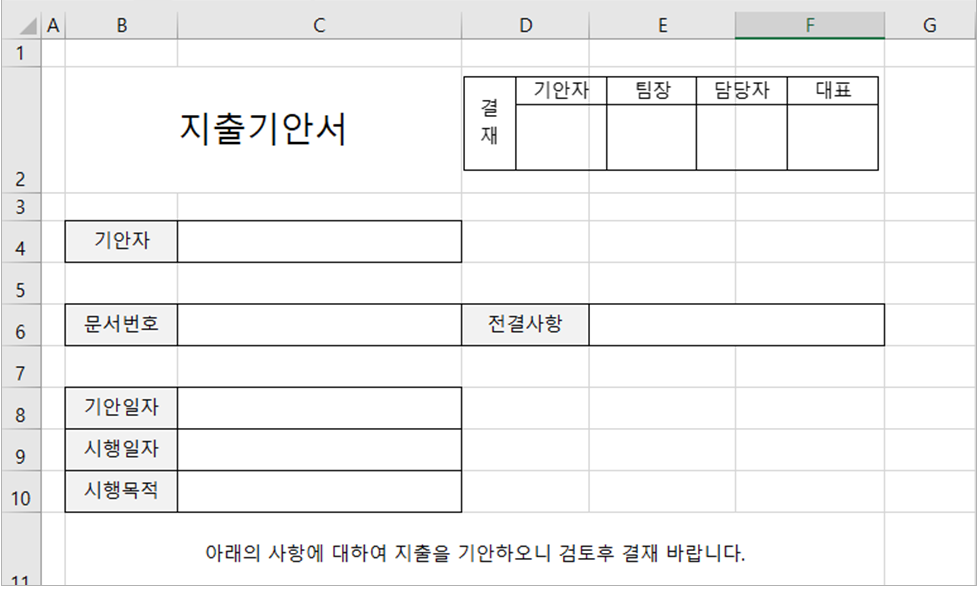 8. [B11] 셀을 선택하고 ‘아래의 사항에 대하여 지출을 기안하오니 검토 후 결재 바랍니다.’라고 입력하고 <Enter>를 누릅니다.