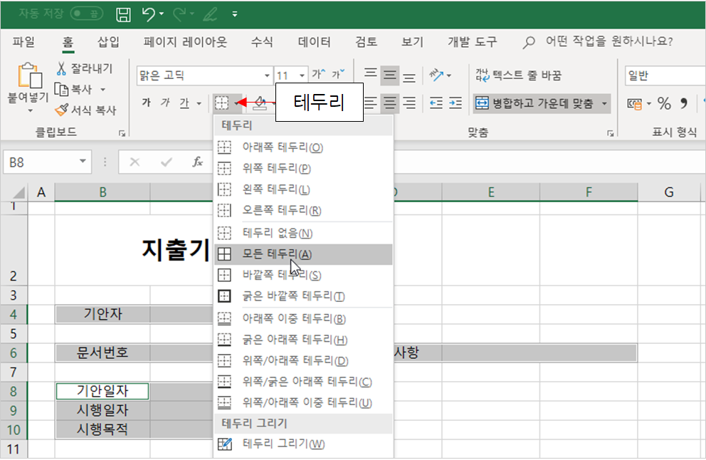 6. 테두리를 [글꼴] 그룹 → [테두리 ▼] → [모든 테두리]를 선택합니다.