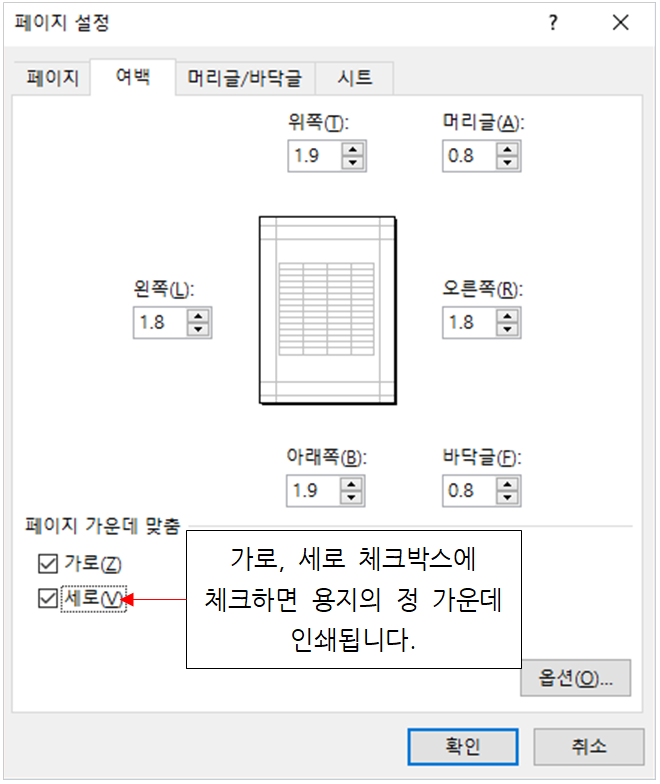 [여백] 탭을 누르고 [페이지 가운데 맞춤] → ‘가로’, ‘세로’ 체크박스에 체크를 합니다.