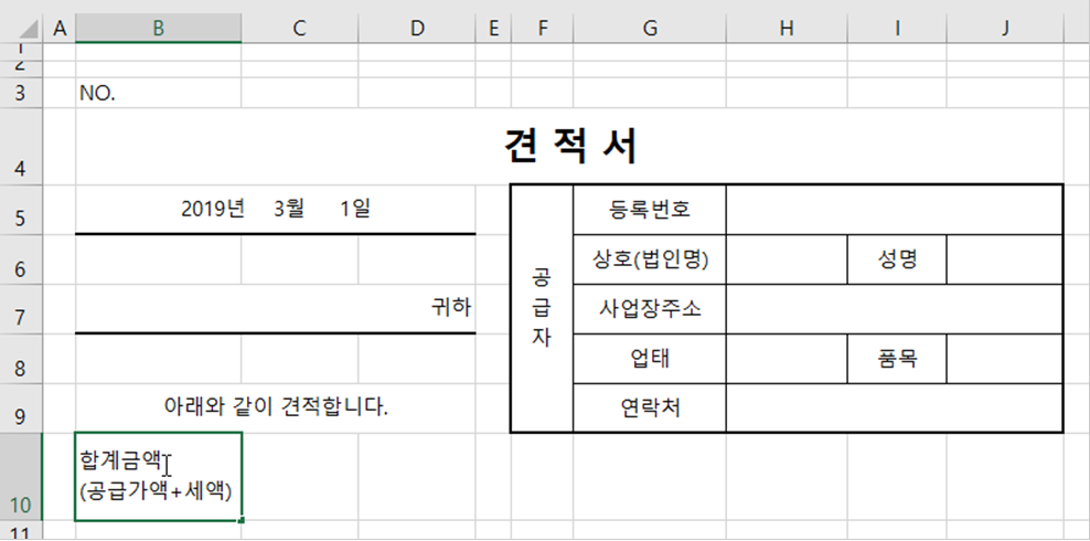 하지만 아직 견적서 모양이 갖추어지지 않았죠? 행 높이도 늘이고 테두리도 설정하면 견적서 형태를 갖추게 될 겁니다.