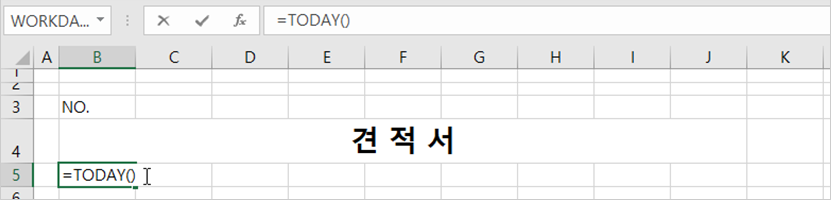 3. [B5] 셀을 선택하고 =TODAY()라고 입력합니다.