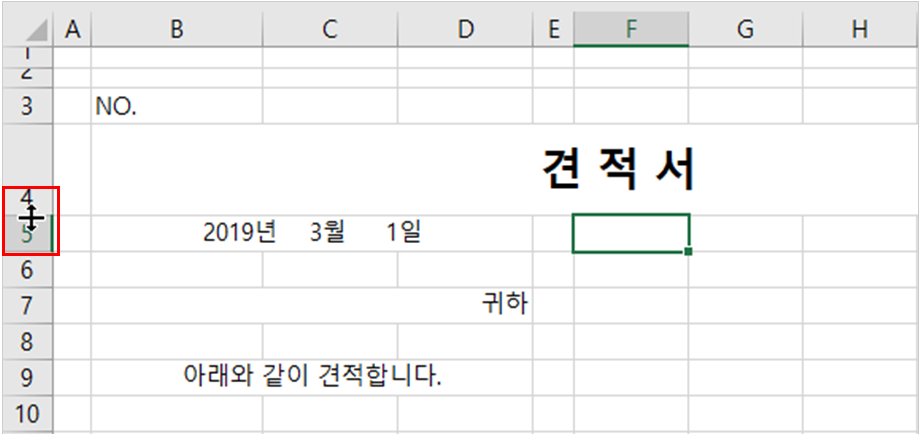 그리고 ‘견적서’가 입력된 [4] 행의 높이도 늘려줍니다.